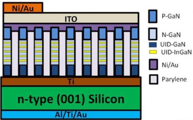 In un "vero giallo diodi emettitori di luce come fosforo per indice di resa cromatica sintonizzabile basati su Laser luce bianca" pubblicato sulla rivista "ACS Photonics", un nanofilo LED (LED NW), capace di crescere su basso costo titanio (Ti) a film sottile / substrato di silicio (Si) piattaforme compatibili con processi CMOS. Suo strato stretto nanofilo può crescere fino a una densità di superficie di 9 x 109 cm ^ 2 con un fattore di riempimento del 88%.